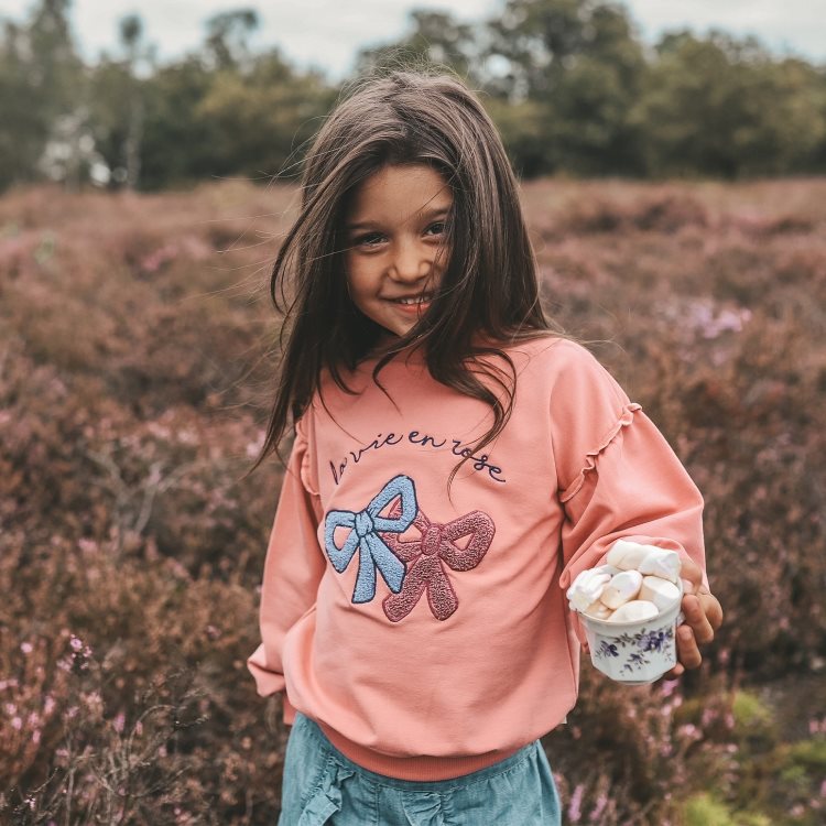 La Vie en rose met de schattige roze trui van Your Wishes uit de Sugar Rush collectie! Verkrijgbaar in maat 80 tot 140, deze meisjestrui biedt een trendy, comfortabele look. De trui is voorzien van zachte teddy-strikken op de voorkant, die een speelse flair toevoegen, en kleine ruffles op de schouders voor een subtiel vrolijk detail. Gemaakt van een hoogwaardige French knit-mix, biedt de trui optimaal comfort voor de lente- en zomerdagen. Combineer deze trui met de Linnen Wide Leg Pants of een bijpassende rok uit de collectie voor een complete, stijlvolle look
