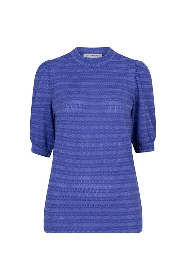 Top Stephany is een aangesloten blauwe top met een patroon in de stof, een hoge