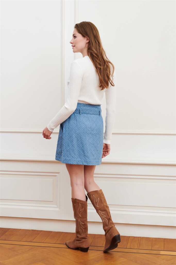 Rok Vive is een denim wrap skirt met knoopsluiting en afneembare riem. De denim rok is qua fit rechtvallend.